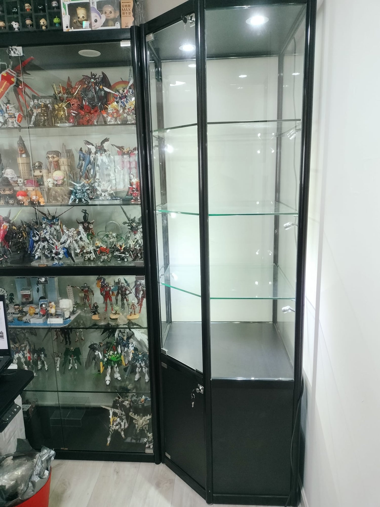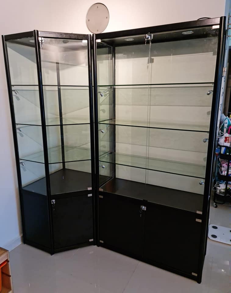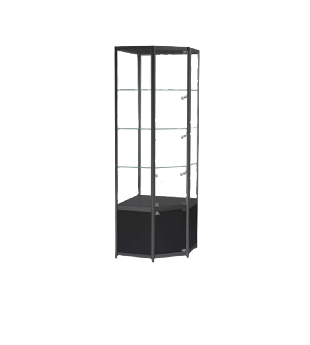The pentagon shape offers a fresh perspective. With below storage for convenience, this cabinet combines bold design and practicality, perfect for showcasing and organizing your essentials.